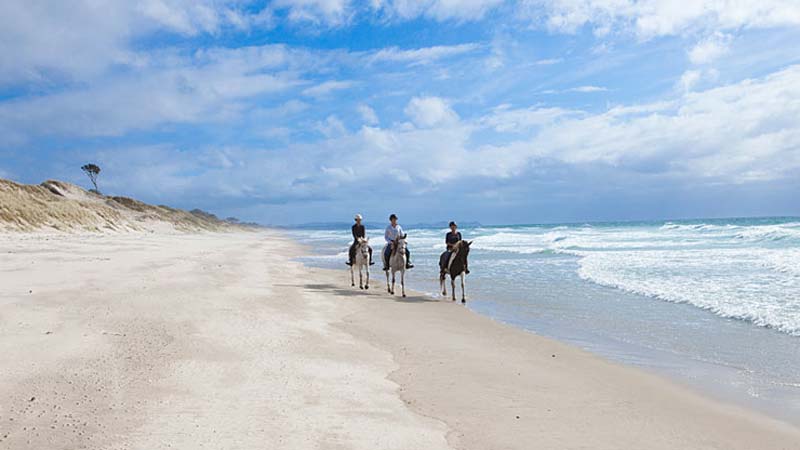 Takes us riding along Te Arai surf beach, through a young pine forest and along the white sands of Pakiri beach and through native forest and high sand dunes. You will climb up a hilly farm track through some cattle country and then back to base at the stables where you will overnight in your Pakiri Beach Accommodation.