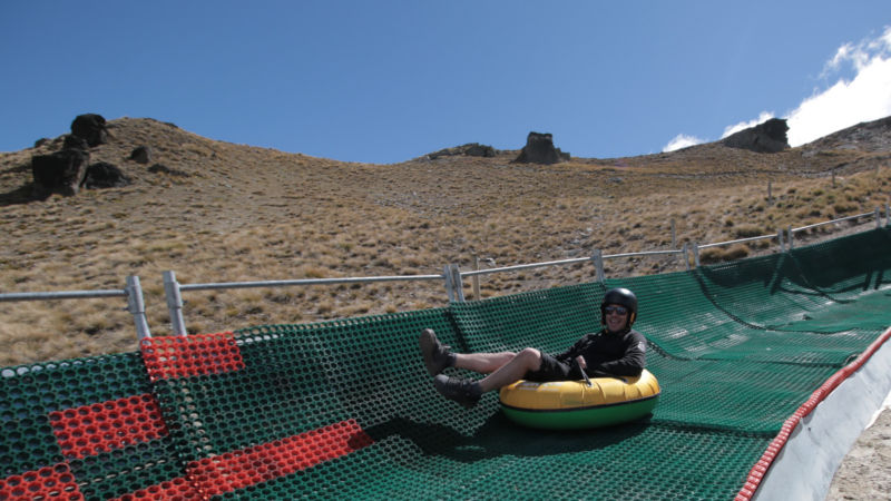 The 150m tubing course is made of synthetic carpet has the same slippery properties as snow, simulating a realistic experience.